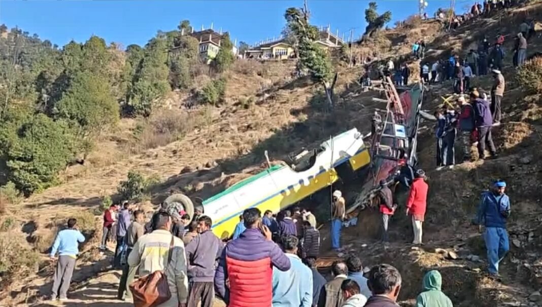 सिरमौर: हिमाचल प्रदेश (Himachal Pradesh) के सिरमौर (Sirmaur) जिले के हरिपुरधार के पास शुक्रवार दोपहर एक बस गहरी खाई में गिर गई, जिसमें सवार 12 लोगों की मौत हो गई और कई अन्य घायल हो गए। खबरों के अनुसार, जीत कोच द्वारा संचालित यह निजी बस कुपवी से शिमला जा रही थी। यह हादसा तब हुआ जब हरिपुरधार बाजार से शिमला की ओर 100 से 200 मीटर की दूरी पर बस चालक ने अचानक नियंत्रण खो दिया, जिससे बस सड़क से फिसलकर गहरी खाई में गिर गई। पुलिस ने बताया कि इस हादसे में नौ लोगों की मौत की पुष्टि हुई है।