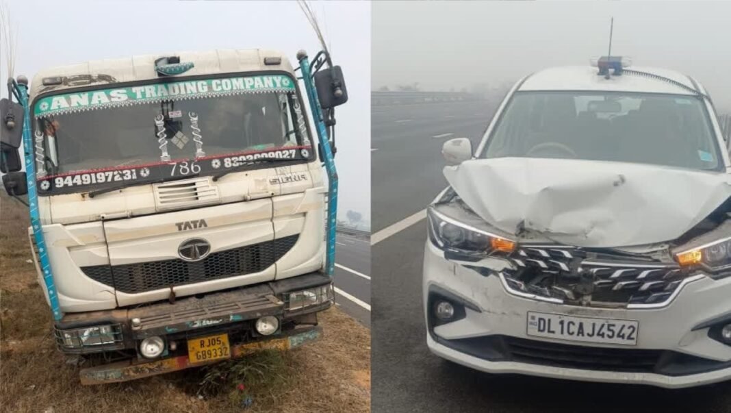 नूह: हरियाणा के नूह जिले में दिल्ली-मुंबई एक्सप्रेसवे (Delhi-Mumbai Expressway) पर पिंगावां क्षेत्र के रिठ्थ गांव के पास पूर्व उपराष्ट्रपति जगदीप धनखड़ (Jagdeep Dhankhar) के काफिले की एक गाड़ी ट्रक से टकरा गई। हालांकि, इस दुर्घटना में कोई भी गंभीर रूप से घायल नहीं हुआ। पुलिस ने बताया कि दिल्ली से जयपुर जा रहे एक ट्रक का टायर फट गया और वह एक्सप्रेसवे पर रुक गया था। एक वैगनआर कार ने ट्रक को पीछे से टक्कर मार दी। इसी दौरान धनखड़ के काफिले में जयपुर की ओर जा रही अन्य कारों ने दुर्घटनास्थल पर पहुंचते ही अचानक ब्रेक लगा दिए, जिससे एक एर्टिगा काफिला ट्रक से टकरा गया।