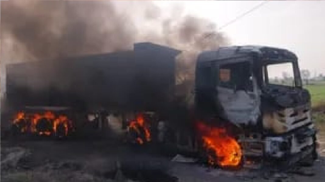 मैनपुरी: थाना बिछवां क्षेत्र अंतर्गत जगतपुर गांव में शनिवार को एक बड़ा हादसा (major accident) होते-होते टल गया। गांव के पास से गुजर रहे एक डंपर ने अचानक नियंत्रण खो दिया और सड़क किनारे लगे हाईटेंशन विद्युत लाइन (high-tension line pole) के पोल से जा टकराया। टक्कर लगते ही डंपर में आग भड़क उठी, जिससे मौके पर अफरा-तफरी मच गई।