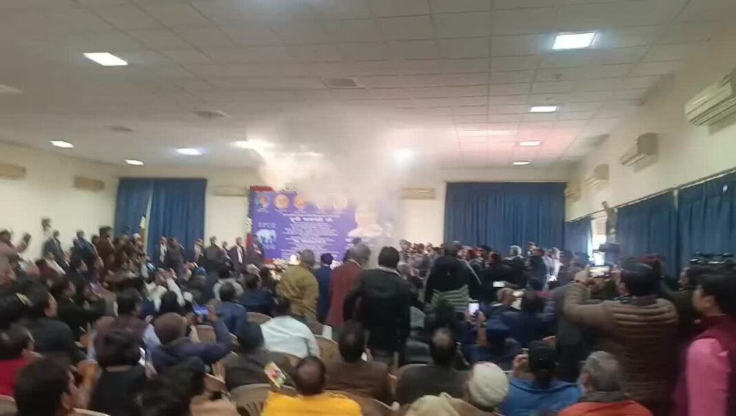 लखनऊ: बहुजन समाज पार्टी (BSP) अध्यक्ष मायावती (Mayawati) द्वारा संबोधित प्रेस कॉन्फ्रेंस के दौरान गुरुवार को शॉर्ट सर्किट के कारण कमरे में धुआं भर जाने से कुछ देर के लिए अफरा-तफरी मच गई। पार्टी नेताओं ने बताया कि इस घटना में कोई हताहत नहीं हुआ।