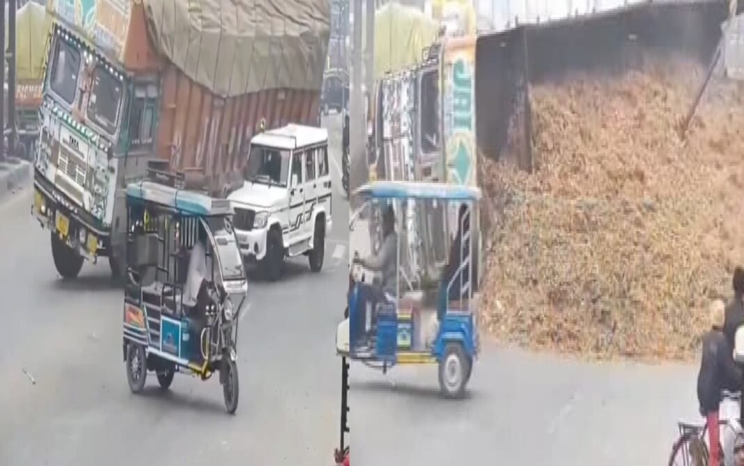 रामपुर: उत्तर प्रदेश के रामपुर (Rampur) जिले के थानागंज इलाके में दिल्ली-नैनीताल राजमार्ग (Delhi-Nainital Highway) 87 पर स्थित व्यस्त पहाड़ी गेट चौराहे पर रविवार को एक दुखद घटना में, भूसे से लदे ट्रक के पलट जाने से महिंद्रा बोलेरो एसयूवी के चालक की मौत हो गई। घटना का वीडियो सोशल मीडिया पर वायरल हो रहा है। वीडियो में बिजली विभाग के एक सब-डिविजनल ऑफिसर के वाहन चालक फिरासत (54) को चलाते हुए दिखाया गया है कि बोलेरो चौराहे पर थोड़ा बाएँ मुड़ रही थी।