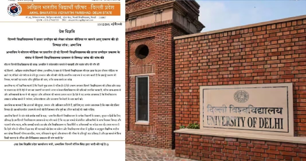 नई दिल्ली: अखिल भारतीय विद्यार्थी परिषद (ABVP) ने शुक्रवार को दिल्ली विश्वविद्यालय (Delhi University) में कथित छात्रा (student) उत्पीड़न मामले की निष्पक्ष, पारदर्शी और स्वतंत्र जांच की मांग की, जो हाल ही में सोशल मीडिया के माध्यम से सामने आया है। यह मांग दिल्ली विश्वविद्यालय की एक छात्रा द्वारा ऑनलाइन पोस्ट किए गए एक वीडियो के वायरल होने के बाद आई है, जिसने व्यापक चिंता और बहस को जन्म दिया है।