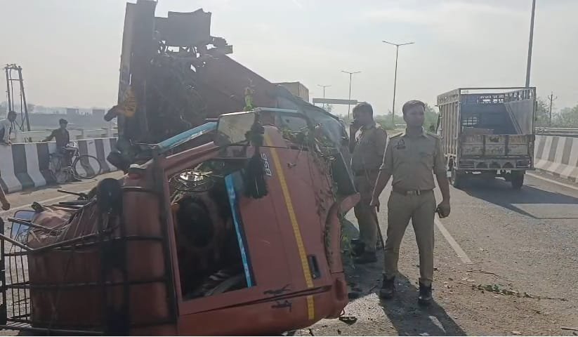 डिवाइडर से टकराकर दो टुकड़ों में बंटी डीसीएम , चालक-हेल्पर गंभीर घायल