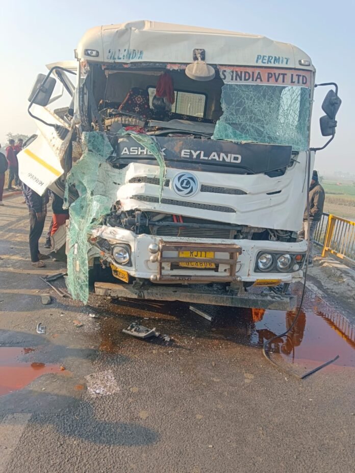 अमृतपुर, फर्रुखाबाद| थाना राजेपुर क्षेत्र में उस समय हड़कंप मच गया जब सुबह तड़के तीन वाहनों की आपस में भिड़ंत हो गई। जिसके चलते एक व्यक्ति गंभीर रूप से घायल हो गया। बताया जा रहा है कि ट्रक संख्या UP74T-5763 का चालक अज्ञात अपने ट्रक को लेकर शाहजहांपुर से फर्रुखाबाद की ओर आ रहा था। तभी फर्रुखाबाद की ओर से स्वराज ट्रैक्टर संख्या UP76AD-7899 का चालक श्री अंकित पुत्र श्री गजेंद्र सिंह निवासी सेंट्रल जेल टिकूरियान नंगला थाना कादरी गेट उम्र 35 वर्ष ट्राली में आलू लादकर फर्रुखाबाद से शाहजहांपुर की तरफ जा रहा था इसी बीच डंपर RJ11GC4808 के ड्राइवर दिनेश सिंह पुत्र टिजन सिंह निवासी गांव हरपुरा थाना गोहद जिला भिंड उम्र करीब 30 वर्ष द्वारा डंपर को ओवरटेक कर ट्रक संख्या UP74T-5763 मे टक्कर मार दी जिससे दोनों ट्रक क्षतिग्रस्त हो गये जिसमें ड्राइवर दिनेश उपरोक्त गंभीर रूप से घायल हो गया सूचना मिलते ही मौके पर थाना अध्यक्ष सुदेश कुमार फोर्स के साथ मौके पर पहुंचे और घायलों को 108 एंबुलेंस की सहायता से राम मनोहर लोहिया अस्पताल भिजवाया गया। जाम की स्थिति बनते ही थाना अध्यक्ष ने तत्काल ही एक्शन लेते हुए ट्रक व डंपर को हाइड्रा की मदद से सड़क से हटवाया