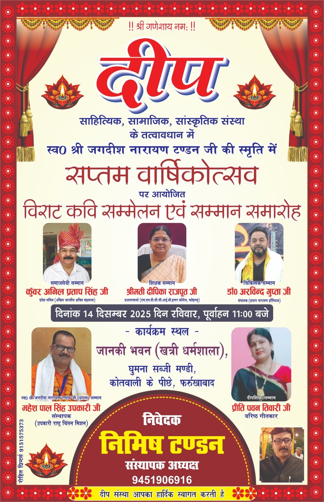 फर्रुखाबाद। साहित्यिक सामाजिक एवं सांस्कृतिक संस्था दीप के तत्वाधान में सातवां वार्षिक उत्सव व सम्मान समारोह 14 दिसंबर को धूमधाम के साथ आयोजित होगा।