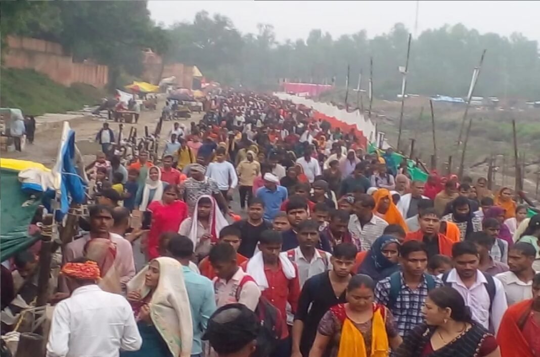 अयोध्या:रामजन्मभूमि अयोध्या (Ayodhya) में 42 किलोमीटर लंबी 14 कोसी परिक्रमा (Kosi Parikrama) जारी है। आज गुरुवार को भी भारी बारिश के बावजूद लगभग दस लाख श्रद्धालु धार्मिक उत्साह और उमंग के साथ शहर में उमड़ रहे हैं। खराब मौसम और भारी बारिश के बावजूद, श्रद्धालु खुद को पॉलीथीन, बोरियों और तिरपालों से ढककर ‘जय श्री राम’ के नारों के बीच नंगे पैर चलते दिखाई दे रहे हैं। कभी-कभी, वे रास्ते की मिट्टी को अपने माथे पर लगाते हैं और हाथ जोड़कर आशीर्वाद लेते हैं। प्रशासन के अनुसार, सरयू में स्नान करने के बाद आज सुबह से ही लगभग दस लाख श्रद्धालु परिक्रमा कर रहे हैं।