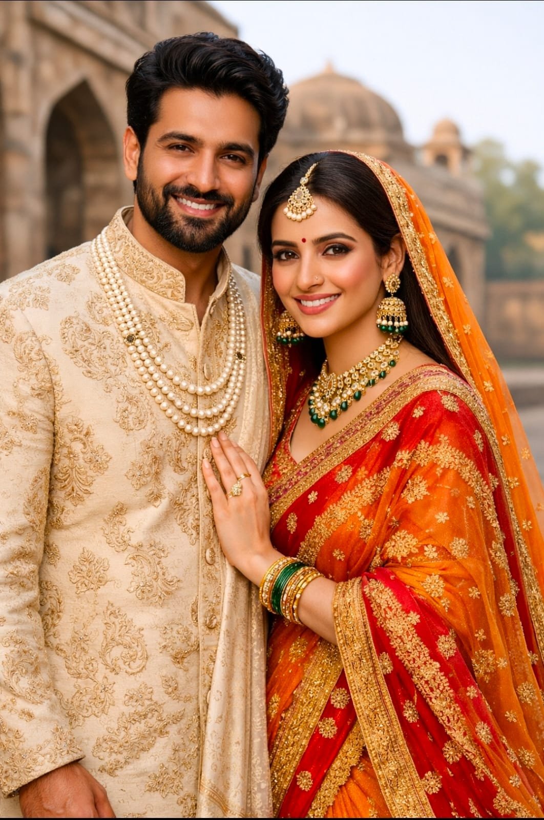ऐतिहासिक धरोहर की पृष्ठभूमि में खिंची यह तस्वीर भारतीय संस्कृति, परंपरा और दांपत्य सौंदर्य का जीवंत उदाहरण प्रस्तुत करती है। पारंपरिक परिधान में सजे इस नवदंपति का आत्मविश्वास और मुस्कान यह दर्शाती है कि आधुनिकता के दौर में भी भारतीय रीति-रिवाजों की चमक कम नहीं हुई है।