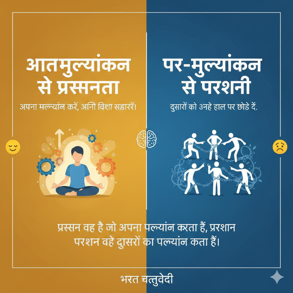 “प्रसन्न वह है जो अपना मूल्यांकन करता है, परेशान वह है जो दूसरों का मूल्यांकन करता है”—यह पंक्ति आधुनिक जीवन की सबसे गहरी सच्चाइयों में से एक को उजागर करती है। मनुष्य का मन जितना भीतर की ओर मुड़ता है, उतना ही शांत होता है; और जितना बाहर दूसरों की ओर भटकता है, उतना ही अशांत। सुख और दुख के इस फर्क को समझना ही आत्मिक परिपक्वता की पहली सीढ़ी है।