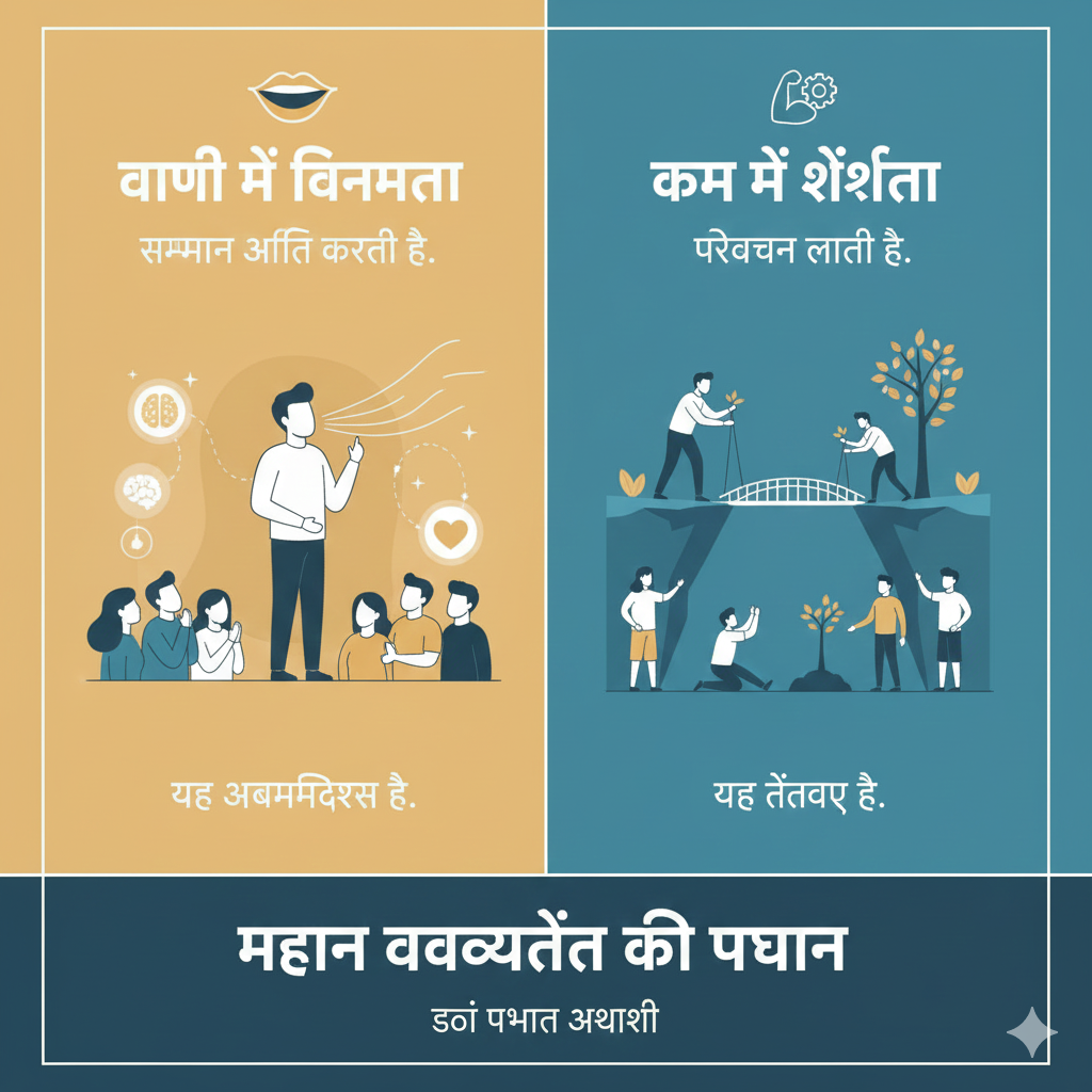 समाज में व्यक्ति की पहचान उसके शब्दों से पहले उसके कर्मों से होती है, लेकिन शब्दों का महत्व भी कम नहीं। श्रेष्ठ व्यक्ति वही होता है जिसकी वाणी में विनम्रता हो और जिसके कार्यों में श्रेष्ठता दिखाई दे। यह सूत्र केवल नैतिक उपदेश नहीं, बल्कि जीवन की वह कसौटी है जिस पर महान व्यक्तित्व खरे उतरते हैं।