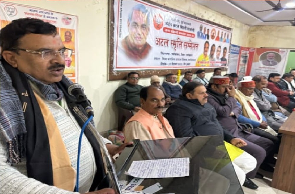 फर्रुखाबाद: बुधवार को आवास विकास कॉलोनी स्थित भाजपा जिला मुख्यालय (BJP District Headquarters) पर पूर्व प्रधानमंत्री अटल बिहारी वाजपेई (Former Prime Minister Atal Bihari Vajpayee) की जन्म जयंती पखवाड़ा के अंतर्गत सदर विधानसभा क्षेत्र का अटल स्मृति सम्मेलन आयोजित हुआ में।जिसमें मुख्य वक्ता के रूप में कानपुर बुंदेलखंड क्षेत्र के क्षेत्रीय अध्यक्ष प्रकाश पाल मौजूद रहे।कार्यक्रम की अध्यक्षता भाजपा जिलाध्यक्ष फतेहचंद वर्मा ने की। कार्यक्रम के संयोजक अतुल दीक्षित ने आभार व्यक्त किया।