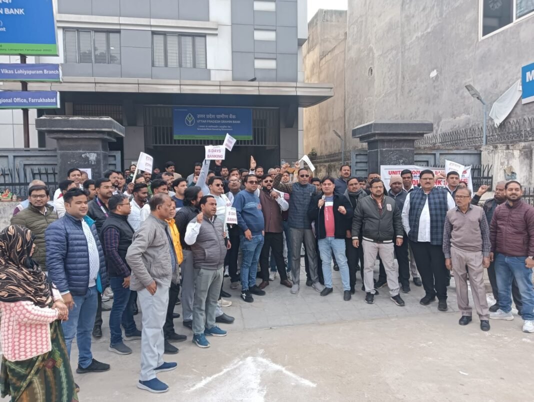 फर्रुखाबाद। यूनाइटेड फोरम ऑफ बैंक यूनियंस के आह्वान पर मंगलवार को जिले में सभी बैंकों के अधिकारी और कर्मचारी पूरे दिन की हड़ताल पर रहे। बैंककर्मी पाँच दिवसीय बैंकिंग सप्ताह की मांग को लेकर आंदोलनरत रहे, जिससे जिले में बैंकिंग व्यवस्था पूरी तरह ठप रही।