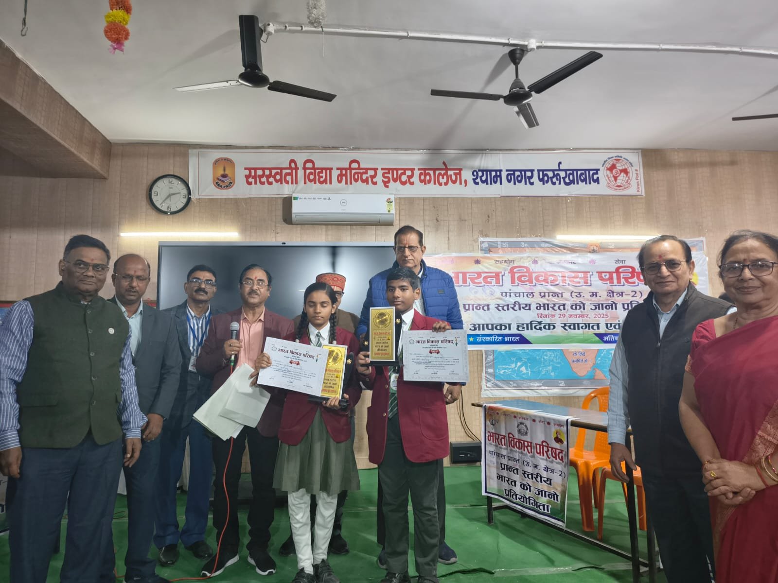 फर्रुखाबाद। भारत विकास परिषद पांचाल प्रांत (उत्तर मध्य क्षेत्र 2) की प्रांत स्तरीय भारत को जानो प्रतियोगिता का आयोजन बजरंग शाखा फतेहगढ़ के आतिथ्य श्यामनगर स्थित सरस्वती विद्या मंदिर इंटर कॉलेज के सभागार हुआ।सर्वप्रथम मंचासीन अतिथियों द्वारा भारत माता एवं विवेकानंद के चित्र पर पुष्प अर्पण कर द्वीप प्रज्वलन किया। सभी ने अपने स्थान पर खड़े होकर वंदेमातरम गीत गाया। प्रांतीय अध्यक्ष इंद्र नारायण पाण्डेय ने आए हुए अतिथियों का पुष्प रूपी शब्दों से स्वागत किया।आतिथ्य शाखा की शाखा गतिविधि संयोजक महिला सहभागिता श्रीमती विंदु दुबे ने सभी अतिथियों का वंदन तिलक लगाकर एवं सचिव अवनींद्र सक्सेना ने उत्तरी पहनाकर स्वागत वंदन किया।प्रतियोगिता में पांचाल प्रांत के चार जनपदों (औरैया, इटावा, कन्नौज और फर्रुखाबाद) की विभिन्न शाखाओं की कनिष्ठ एवं वरिष्ठ वर्ग की एक दर्जन टीमों ने भागीदारी की। कार्यक्रम के मुख्य अतिथि भारत विकास परिषद के पूर्व राष्ट्रीय अध्यक्ष सुरेश चंद्र गुप्ता एवं क्षेत्रीय पर्यवेक्षक संजय दुआ, विशिष्ट अतिथि राकेश कुमार श्रीवास्तव अध्यक्ष ब्रह्मावर्त प्रांत ,जी. के. मिश्रा प्रांतीय महासचिव मौजूद रहे।