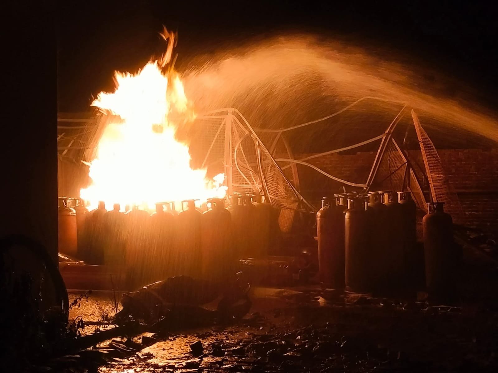 आग इतनी तेज़ थी कि अंदर रखे छोटे-छोटे गैस सिलेंडर और ड्रम लगातार फटते रहे।