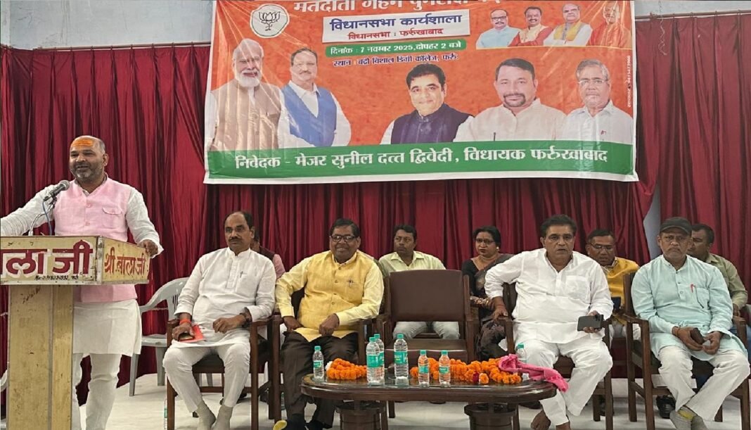 फर्रुखाबाद: शुक्रवार को भारतीय जनता पार्टी (BJP) द्वारा मतदाता गहन पुनरीक्षण अभियान के संदर्भ में सदर विधानसभा (Assembly Sadar) क्षेत्र की जिला कार्यशाला आयोजित हुई ।जिसमें मुख्य अतिथि कानपुर बुंदेलखंड क्षेत्रीय मंत्री देवेंद्र देव गुप्ता ने इस अभियान से संबंधित विषयों पर कार्यकर्ताओं को जानकारी देते हुए इस अभियान से जुड़ने के निर्देश दिए।