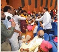 लखनऊ| राजधानी के इंदिरा गांधी प्रतिष्ठान में शनिवार को आयोजित अखिल भारतीय ब्राह्मण महासभा के प्रबुद्ध समागम में उस समय माहौल गरमा गया, जब यूजीसी के नए प्रावधानों को लेकर जवाब मांगते हुए लोगों ने जमकर नारेबाजी शुरू कर दी। कार्यक्रम में पहुंचे भाजपा सांसद एवं पूर्व उपमुख्यमंत्री डॉ. दिनेश शर्मा को तीखे विरोध का सामना करना पड़ा और शोर-शराबे के बीच उन्हें अपना भाषण अधूरा छोड़ना पड़ा।