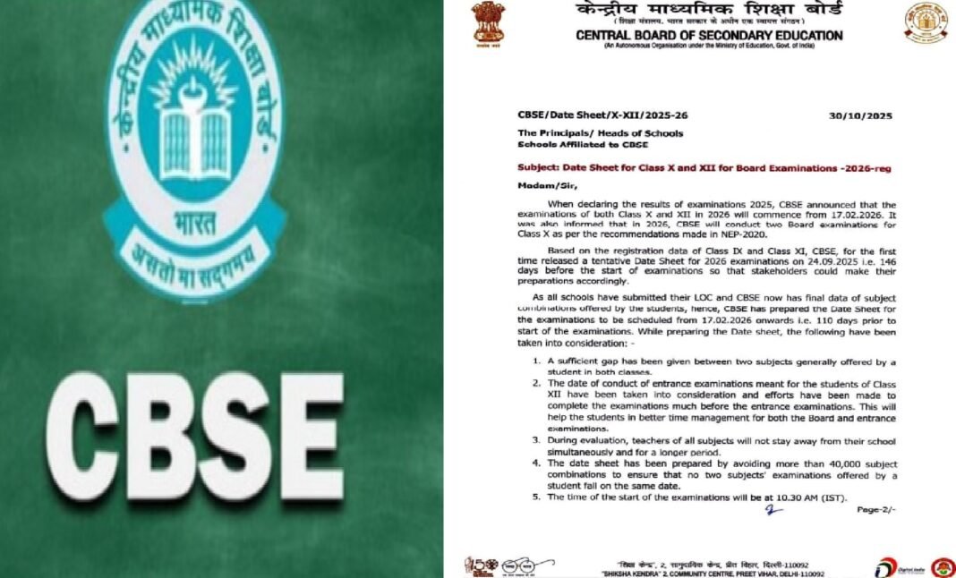 नई दिल्ली: केंद्रीय माध्यमिक शिक्षा बोर्ड (CBSE) ने गुरुवार को घोषणा की कि 2026 में दसवीं और बारहवीं दोनों कक्षाओं की परीक्षाएँ (exams) 17 फरवरी 2026 से शुरू होंगी। 2026 में सीबीएसई नई शिक्षा नीति-2020 में की गई सिफारिशों के अनुसार, दसवीं कक्षा के लिए दो बोर्ड परीक्षाएँ आयोजित करेगा। पहली बार, परीक्षा शुरू होने से लगभग 110 दिन पहले डेटशीट जारी की गई है। यह स्कूलों द्वारा समय पर एलओसी जमा करने के कारण संभव हो पाया है।