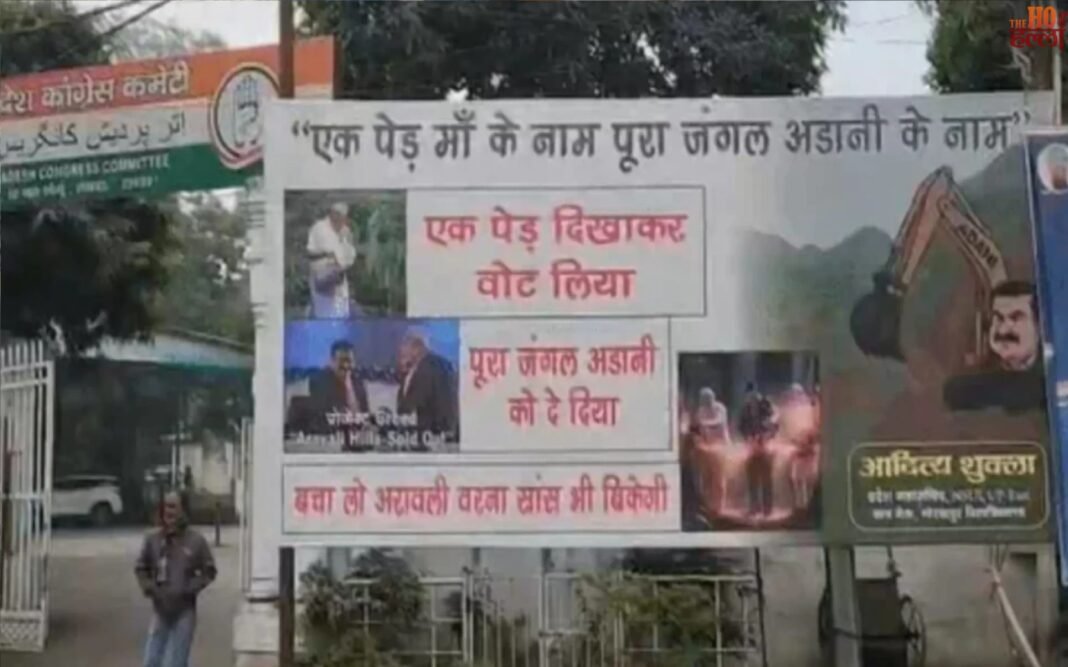 होर्डिंग पर लिखे नारे हैं: “मां के नाम एक पेड़, अडानी के नाम पूरा जंगल। एक पेड़ दिखाकर वोट लिए गए, लेकिन पूरा जंगल अडानी को सौंप दिया गया।” एक अन्य संदेश में चेतावनी दी गई है: “अरावली पर्वतमाला को बचाओ, वरना हवा भी बिक जाएगी।” यह होर्डिंग एनएसयूआई ईस्ट के महासचिव आदित्य शुक्ला ने लगवाया था।