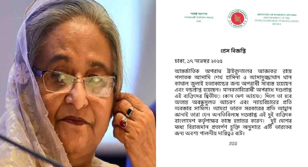 बांग्लादेश विदेश मंत्रालय ने अपने बयान में कहा, अंतर्राष्ट्रीय अपराध न्यायाधिकरण के आज के फैसले में, फरार अभियुक्त शेख हसीना और असदुज्जमां खान कमाल को जुलाई नरसंहार के लिए दोषी पाया गया और सजा सुनाई गई। मानवता के विरुद्ध अपराधों के दोषी इन व्यक्तियों को किसी भी दूसरे देश द्वारा शरण देना अत्यंत अमित्रतापूर्ण कार्य होगा और न्याय की अवमानना के समान होगा। हम भारत सरकार से आग्रह करते हैं कि वह इन दोनों दोषियों को बिना किसी देरी के तुरंत बांग्लादेशी अधिकारियों को सौंप दे। दोनों देशों के बीच मौजूदा प्रत्यर्पण संधि के अनुसार, यह भारत का भी अनिवार्य कर्तव्य है।
