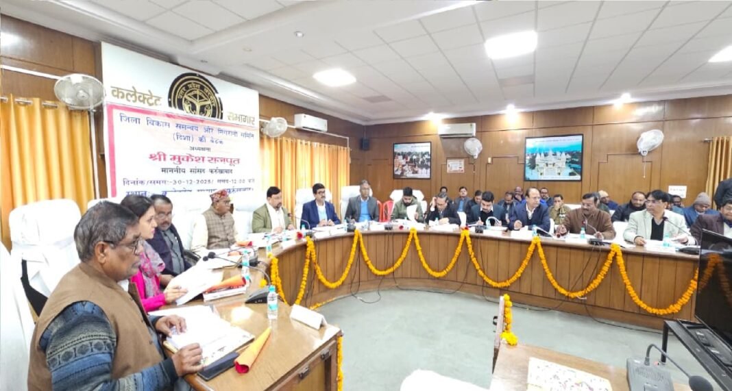 फर्रुखाबाद: जनपद में विकास योजनाओं की प्रगति और क्रियान्वयन की समीक्षा को लेकर सोमवार को कलेक्ट्रेट सभागार (Collectorate Auditorium) में जिला विकास समन्वय एवं निगरानी समिति (दिशा) की बैठक आयोजित की गई। बैठक की अध्यक्षता माननीय सांसद मुकेश राजपूत (MP Mukesh Rajput) ने की। बैठक में जिला पंचायत अध्यक्ष मोनिका यादव, विधायक अमृतपुर सुशील कुमार शाक्य, विधायक भोजपुर नागेन्द्र सिंह राठौर, विधायक कायमगंज डॉ. सुरभि गंगवार, सदस्य विधान परिषद प्रांशु दत्त द्विवेदी, नगर पंचायत अध्यक्षों सहित जनपद स्तरीय अधिकारी एवं जनप्रतिनिधि मौजूद रहे।