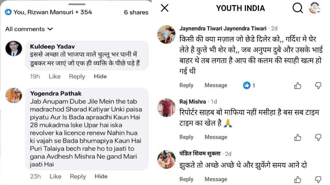 दैनिक यूथ इंडिया में माफिया के खिलाफ हो रही प्रशासनिक कार्रवाइयों की प्रमुखता से प्रकाशित खबरों के बाद सोशल मीडिया पर कथित गैंग से जुड़े कुछ लोगों द्वारा लगातार आपत्तिजनक टिप्पणियां और अप्रत्यक्ष धमकियां दी जा रही हैं। आरोप है कि इन गतिविधियों का संचालन कथित रूप से माफिया के प्रमुख साथी अवधेश मिश्रा द्वारा किया जा रहा है। सोशल मीडिया पर किसी अवधेश मिश्रा के सगे साले द्वारा योगेश पाठक द्वारा भी माफिया अनुपम दुबे के विरुद्ध प्रकाशित खबर पर फेसबुक के जरिए कथित रूप से सीधी धमकी दी गई है। इस पूरे प्रकरण की सूचना उच्चाधिकारियों को दे दी गई है।