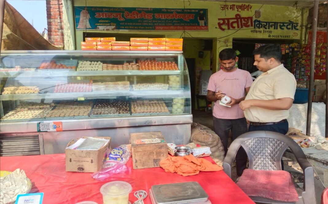 मोहम्मदाबाद,फर्रुखाबाद: त्योहारी सीजन के मद्देनज़र खाद्य विभाग (Food department) की टीम ने सोमवार को कस्बा मोहम्मदाबाद और आसपास के क्षेत्रों में मिष्ठान भंडारों पर छापेमारी की। खाद्य सुरक्षा अधिकारी शिवराज सिंह और अरुण मिश्रा के नेतृत्व में की गई कार्रवाई के दौरान कई दुकानदार अपनी दुकानें बंद कर मौके से फरार हो गए।