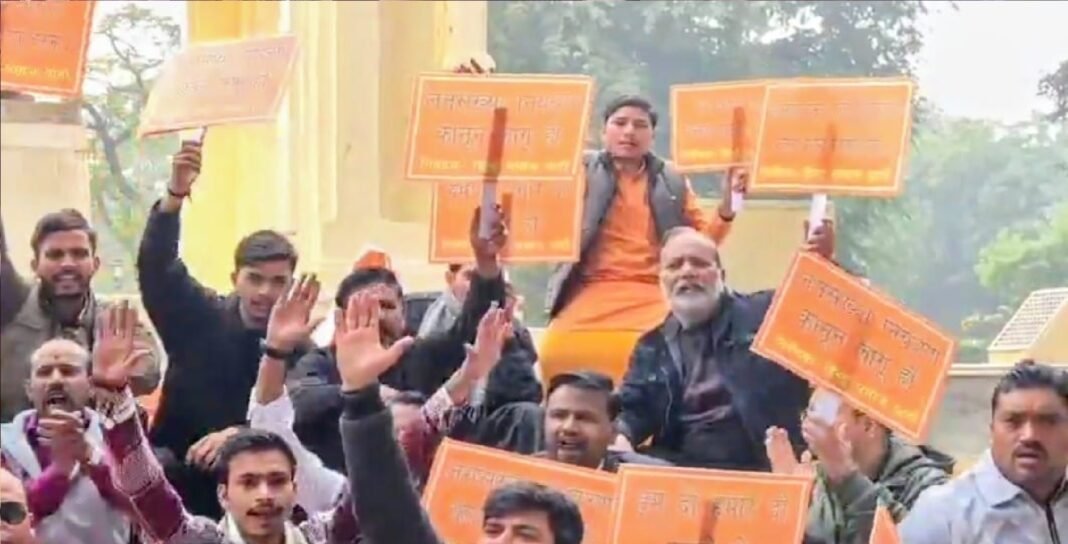 लखनऊ: जनसंख्या नियंत्रण कानून (population control law) लागू करने की मांग को लेकर हिन्दू समाज पार्टी (Hindu Samaj Party) के कार्यकर्ताओं ने मंगलवार को राजधानी लखनऊ के हजरतगंज स्थित जीपीओ पर जोरदार विरोध प्रदर्शन किया। प्रदर्शनकारियों ने बढ़ती जनसंख्या को देश की गंभीर समस्या बताते हुए केंद्र सरकार से तत्काल कड़ा जनसंख्या नियंत्रण कानून बनाने की मांग की।