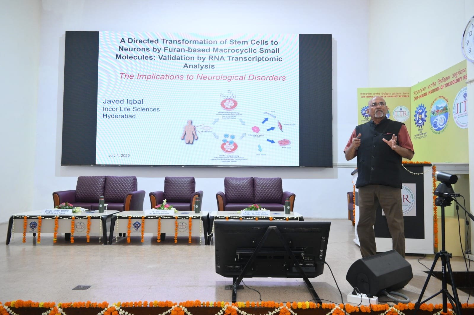 मुख्य वक्ता के रूप में उपस्थित प्रोफेसर जावेद इकबाल, संस्थापक व अध्यक्ष, इंकोर लाइफ साइंसेज, हैदराबाद, ने “A Directed Transformation of Stem Cells to s by Furan-Based Macrocyclic Small Molecules: Validation by RNA Transcriptomic Analysis” विषय पर व्याख्यान दिया। उन्होंने स्टेम सेल अनुसंधान में मैक्रोसाइक्लिक अणुओं की भूमिका और उनकी जैविक क्रियाशीलता को विस्तार से समझाया। उनके विचारों ने उपस्थित वैज्ञानिकों और शोधकर्ताओं को नई शोध संभावनाओं की दिशा में प्रेरित किया।