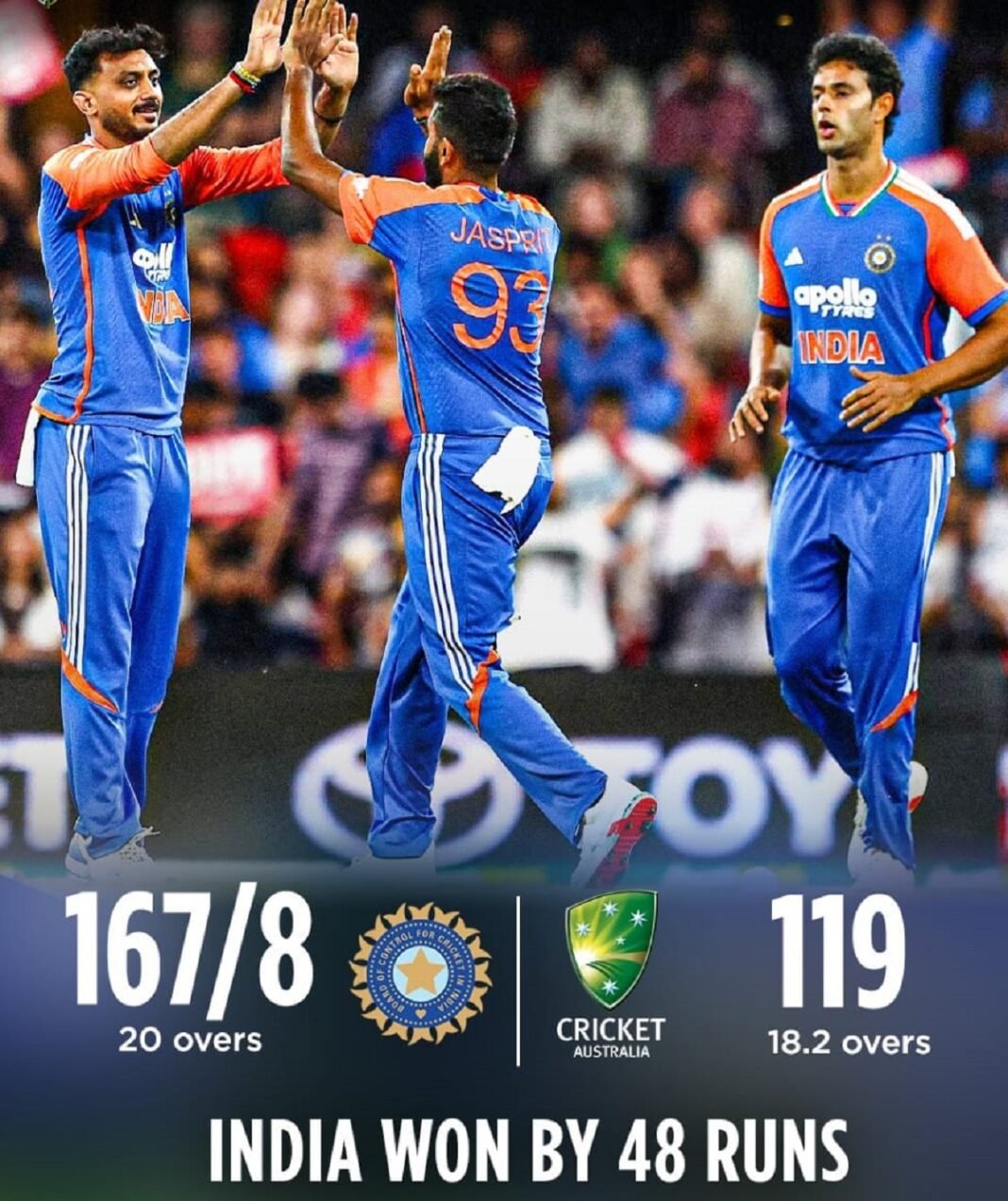 शुभमन गिल के 46 रनों ने भारत का सर्वोच्च स्कोर बनाया और 20 ओवरों में 167/8 का स्कोर बनाया। इससे पहले, ऑस्ट्रेलियाई कप्तान मिशेल मार्श ने क्वींसलैंड के कैरारा ओवल में सूर्यकुमार यादव की अगुवाई वाली भारत के खिलाफ टॉस जीतकर पहले गेंदबाजी करने का फैसला किया। अक्षर पटेल और शिवम दुबे ने दो-दो विकेट लेकर कमाल का प्रदर्शन किया।