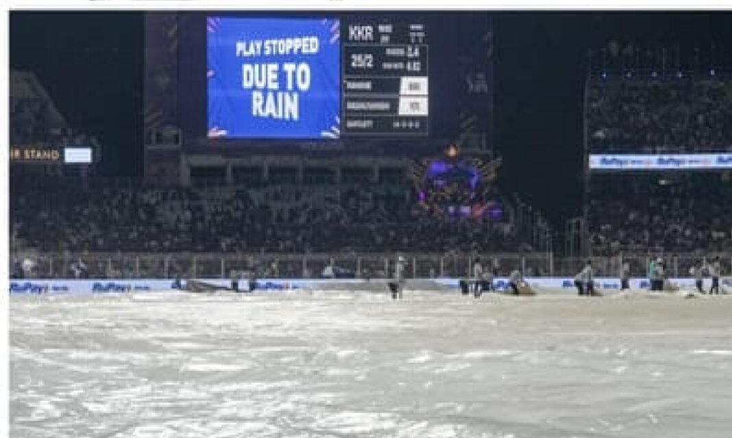 मैच की शुरुआत में कोलकाता नाइट राइडर्स ने टॉस जीतकर पहले बल्लेबाजी का निर्णय लिया था। टीम ने 3.4 ओवर में दो विकेट के नुकसान पर 25 रन बना लिए थे, लेकिन इसी दौरान हल्की बारिश शुरू हो गई, जिसने कुछ ही देर में तेज रूप ले लिया और खेल को रोकना पड़ा।