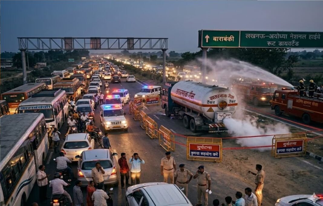 बाराबंकी: यूपी के बाराबंकी के असेनी मोड़ के पास लखनऊ-अयोध्या राजमार्ग (Lucknow-Ayodhya highway) पर एक एलपीजी टैंकर से बड़े पैमाने पर गैस रिसाव के कारण दहशत और यातायात में भारी गड़बड़ी फैल गई। बताया जा रहा यह टैंकर बुधवार रात अचानक गैस लीक (LPG gas leak) करने लगा। रिसाव की गंभीरता को देखते हुए, अधिकारियों को राजमार्ग की दोनों लेन बंद करनी पड़ीं, जिससे लखनऊ, अयोध्या और गोरखपुर को जोड़ने वाले मार्गों पर यातायात बुरी तरह प्रभावित हुआ।