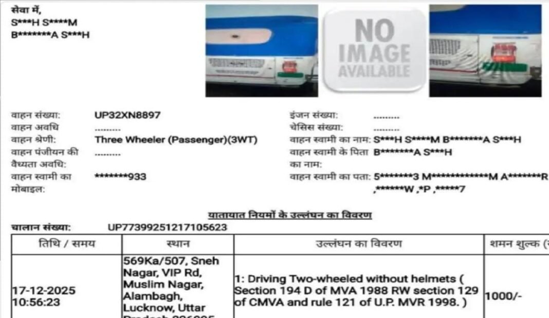 खबरों के मुताबिक, आलमबाग थाना क्षेत्र के अवध चौराहे पर ट्रैफिक पुलिस ने 17 दिसंबर 2025 को एक ई-रिक्शा (यूपी 32 एक्सएन 8897) को बिना हेलमेट चलाने के लिए ₹1000 का चालान भेजा। चालान में ई-रिक्शा की फोटो थी, लेकिन विवरण में “दोपहिया गाड़ी बिना हेलमेट” और कैटेगरी में “थ्री व्हीलर” लिखा था, जो भ्रम पैदा कर रहा था। चालक की प्रतिक्रिया: ई-रिक्शा चालक को चालान मिलने पर हैरानी हुई कि ई-रिक्शा पर हेलमेट कब से अनिवार्य हो गया।