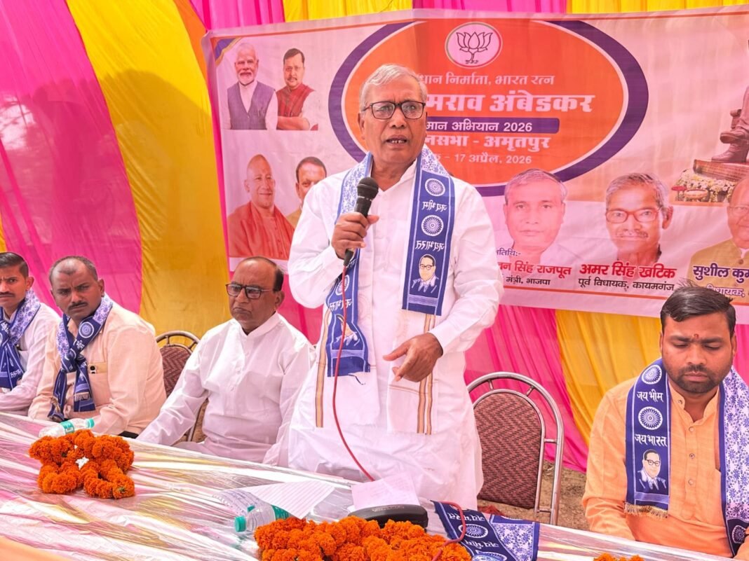 अमृतपुर विधायक सुशील शाक्य ने कहा डॉ आंबेडकर के विचार सामाजिक समानता शिक्षा न्याय और स्वतंत्रता पर आधारित है उन्होंने जाति व्यवस्था छुआछूत और महिलाओं के उत्पीड़न का पुरजोर विरोध किया तथा संवैधानिक अधिकारों बंधुत्व और शिक्षा के माध्यम से दलित व वंचितों वर्ग के उत्थान पर जोर दिया था उनका मुख्य उद्देश्य था शिक्षित बनो संगठित बनो और संघर्ष करो भाजपा सरकार उनके विचारों को लेकर आगे बढ़ रही है।