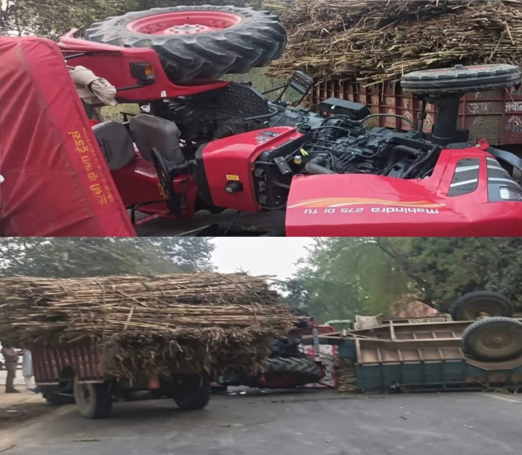 शाहजहांपुर। जनपद के तिलहर क्षेत्र में निगोही रोड पर उस समय बड़ा हादसा टल गया, जब ओवरलोड गन्ना लदे दो ट्रैक्टर आपस में भिड़ गए। टक्कर इतनी जोरदार थी कि एक ट्रैक्टर ट्रॉली अनियंत्रित होकर पलट गई और सड़क पर अफरा-तफरी मच गई।