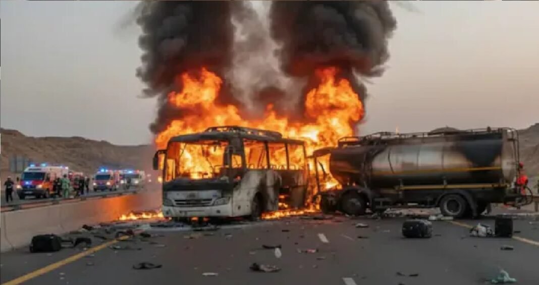 ऐसी खबरें हैं कि सऊदी अरब में सोमवार तड़के एक बस के डीजल टैंकर से टकराने से बस में आग लग गई, जिसमें 42 भारतीय मारे गए हैं। भारतीय समयानुसार रात करीब 1.30 बजे मुफरीहाट के पास दुर्घटना हुई. खलीज टाइम्स की रिपोर्ट के अनुसार, बस में अधिकांश यात्री तेलंगाना के हैदराबाद से थे। माना जा रहा है कि ज़्यादातर पीड़ित हैदराबाद के थे, और खबरों के अनुसार कम से कम 16 लोग मल्लेपल्ली और बाज़ारघाट इलाकों के निवासी थे।