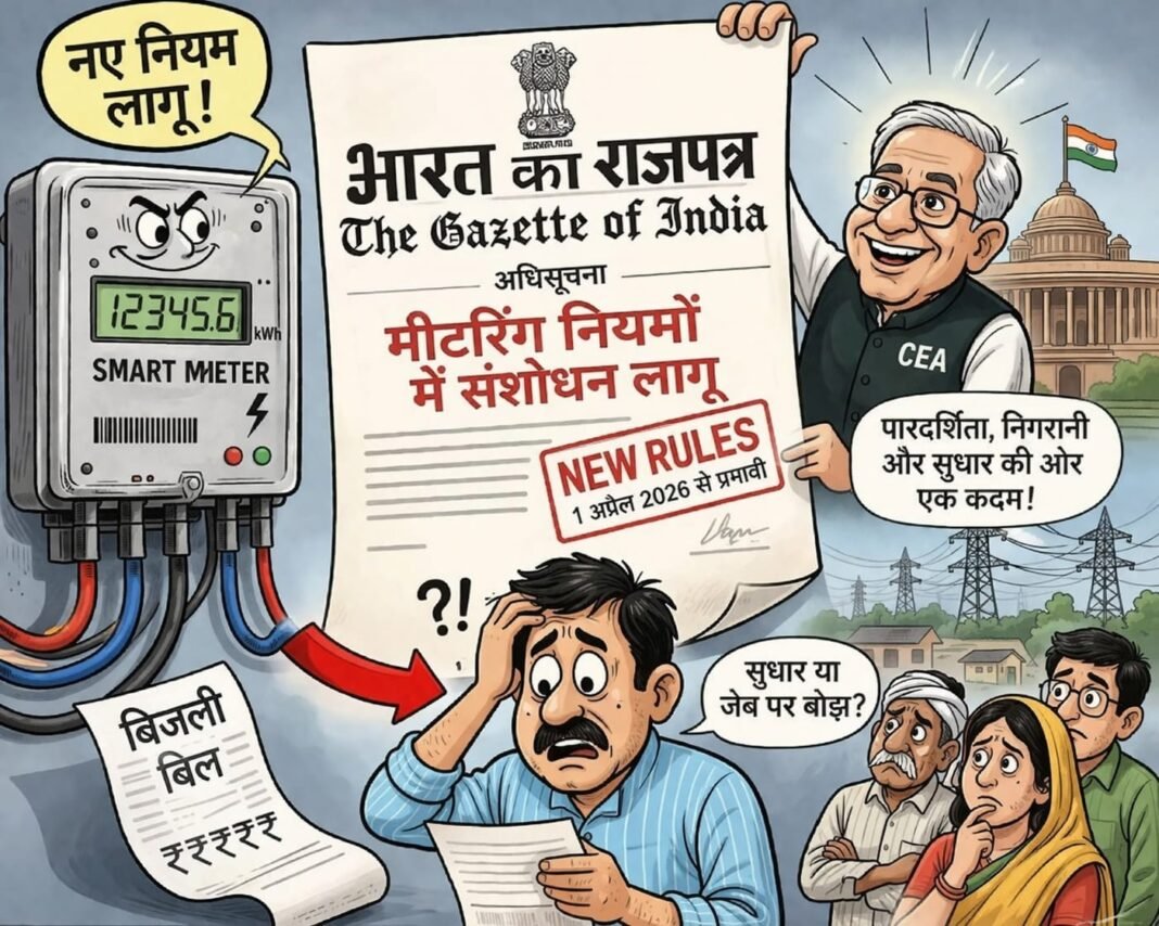 नई दिल्ली। देश की बिजली व्यवस्था में एक बड़ा और निर्णायक बदलाव करते हुए केंद्र सरकार ने मीटरिंग से जुड़े नियमों में संशोधन लागू कर दिया है। यह बदलाव भारत का राजपत्र में प्रकाशित अधिसूचना के जरिए लागू किया गया है, जिसे 1 अप्रैल 2026 से प्रभावी माना जा रहा है। यह संशोधन केंद्रीय विद्युत प्राधिकरण (CEA) द्वारा किया गया है, जिसमें “विद्युत (मीटरों की स्थापना एवं संचालन) विनियम, 2006” में अहम बदलाव शामिल हैं। इस फैसले से पहले फरवरी 2026 में इसका मसौदा जारी कर आम जनता और संबंधित पक्षों से आपत्तियां और सुझाव मांगे गए थे।