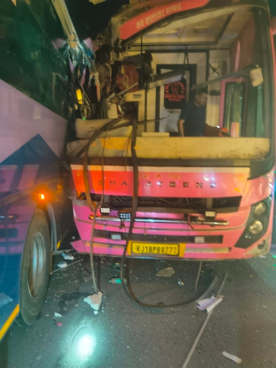 कंटेनर से भिड़ीं दो बसें, एक की मौत—7 घायल, 4 की हालत नाजुक