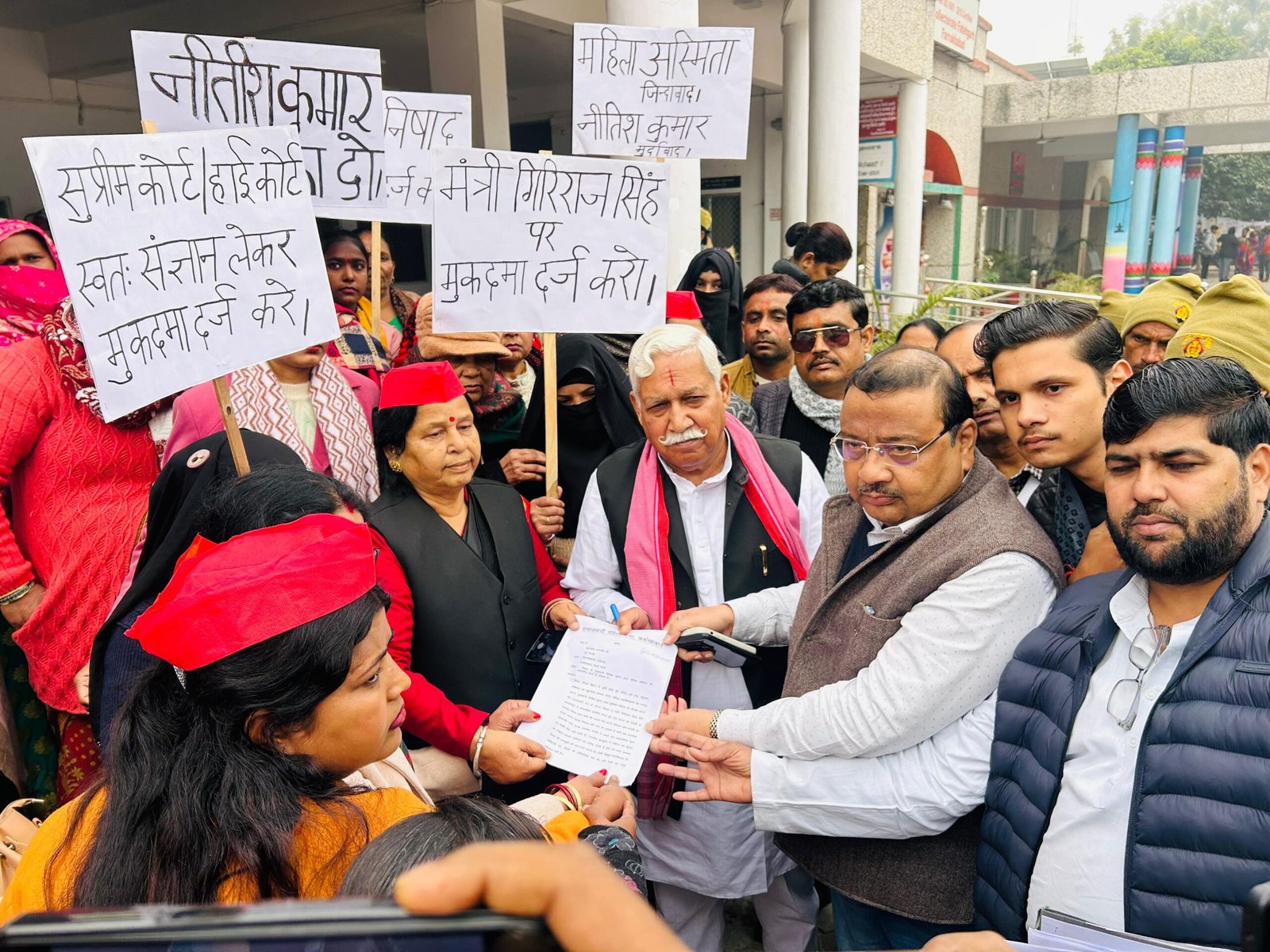 ज्ञापन में कहा गया कि विगत दिवस बिहार में हुयी नारी की गरिमा को ठेस पहुँचाने, संविधान का खुलेआम अपमान करने, महिला सशक्तिकरण का मजाक उड़ाने, मुख्यमंत्री नीतीश कुमार द्वारा मुस्लिम महिला का हिजाब हटाने और सत्ताधारी दल के संजय निषाद व मंत्री गिरिराज सिंह जैसे तबलचियों ने अन्धभक्ति प्रदर्शित करते हुए इस घटना का बेशर्मी से समर्थन किया तथा नारी की लज्जा भंग करने अपमान और बेशर्मी की इससे ज्यादा खराब मिसाल और क्या हो सकती है। ज्ञापन में कहा गया कि भारतीय संस्कृति में महिला का घूँघट या नकाब उसकी अस्मिता का प्रतीक होती है इस पर हाथ लगाना भारत की संस्कृति को तार-तार करना है। ऐसी विकृत मानसिकता के व्यक्तियों को किसी भी संवैधानिक पद पर बने रहने का कोई अधिकार नहीं है। नीतीश इश्तीफा देना चाहिए। धरना प्रदर्शन सपा जिला अध्यक्ष चंद्रपाल सिंह यादव के संरक्षण में तथा महिला सभा की जिला अध्यक्ष सुलक्षणा सिंह के नेतृत्व में किया गया। इस अवसर पर बड़ी तादाद में सफाई हुआ महिलाएं मौजूद रहीं।