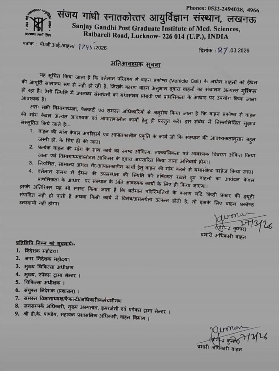 लखनऊ। चिकित्सा संस्थान संजय गाँधी पोस्टग्रेजुएट इंस्टिट्यूट ऑफ़ मेडिकल साइंसस में ईंधन की कमी के चलते वाहन संचालन प्रभावित हो गया है। हालात ऐसे हैं कि अब संस्थान ने वाहनों के उपयोग को फिलहाल केवल इमरजेंसी कार्यों तक सीमित कर दिया है।