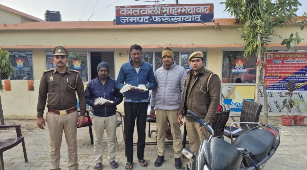 फर्रुखाबाद,मोहम्मदाबाद: पुलिस (Police) ने पशु चोरी की घटनाओं पर बड़ी कार्रवाई करते हुए एक शातिर गिरोह का पर्दाफाश किया है। पुलिस ने दो अभियुक्तों को गिरफ्तार (arrested) कर उनके कब्जे से चोरी की नकदी, अवैध हथियार, कारतूस और एक मोटरसाइकिल बरामद की है। गिरफ्तार अभियुक्तों की पहचान दिनेश उर्फ कल्लू पुत्र राम सिंह और नरेंद्र उर्फ कल्लू उर्फ लम्बे पुत्र अखिलेश, निवासी ग्राम गणेशपुर गढ़िया, थाना मोहम्मदाबाद के रूप में हुई है।