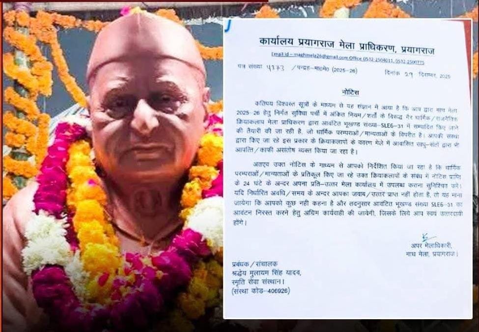 पूरा मामला एक जनवरी को प्रस्तावित शिविर उद्घाटन से जुड़ा है। जानकारी के मुताबिक, एक जनवरी को विधानसभा में नेता प्रतिपक्ष और पूर्व विधानसभा अध्यक्ष माता प्रसाद पांडेय द्वारा मुलायम सिंह यादव स्मृति सेवा संस्थान के शिविर का उद्घाटन किया जाना था। इससे पहले ही मेला प्रशासन और पुलिस हरकत में आ गई। मेला प्रशासन ने संस्थान को आवंटित भूखंड पर कारण बताओ नोटिस चस्पा कर 24 घंटे के भीतर जवाब मांगा है। नोटिस में आरोप लगाया गया है कि सुविधा पर्ची में दर्ज शर्तों के विपरीत मेला क्षेत्र में गैर-धार्मिक और राजनीतिक गतिविधियों की तैयारी की जा रही है।