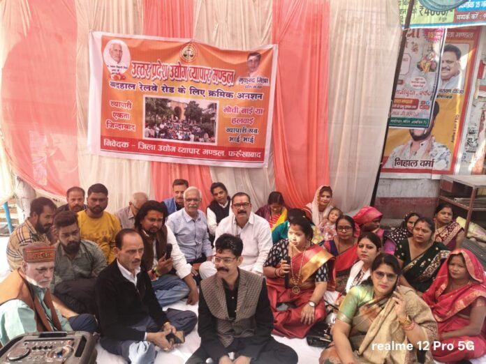 फर्रुखाबाद। रेलवे रोड के निर्माण की मांग को लेकर उत्तर प्रदेश व्यापार मंडल मिश्रा गुट का अनशन चौक पर शुरू हो गया। इस मौके पर रेलवे रोड निर्माण को लेकर धरने में सभी व्यापारियों से एक जुट होकर समर्थन की अपील की गयी।