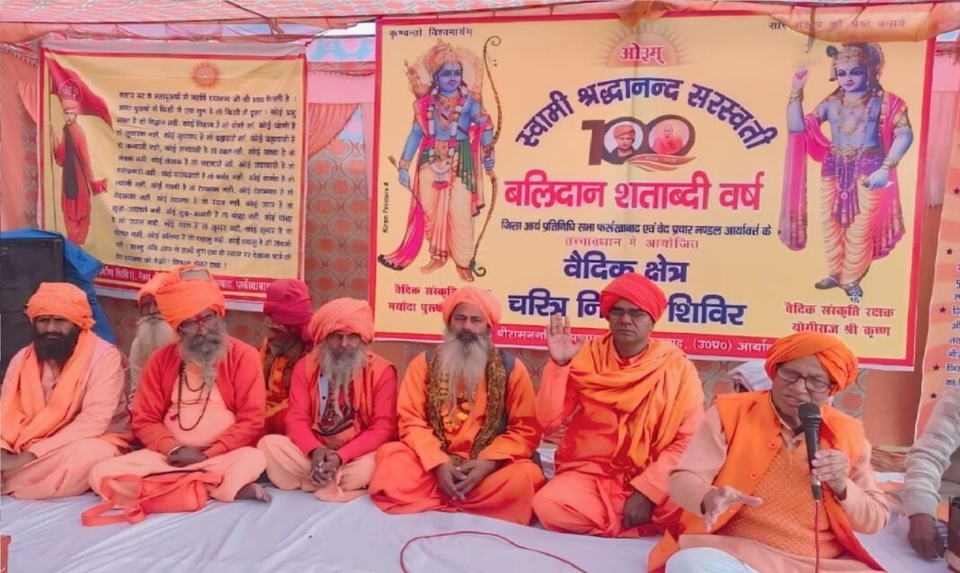 राजस्थान से आए स्वामी आर्य प्रतिनिधि सभा फर्रुखाबाद के तत्वावधान में मेला श्रीरामनगरिया में चल रहे वैदिक क्षेत्र में चरित्र निर्माण शिविर में स्वामी श्रद्धानंद बलिदान शताब्दी वर्ष के उपलक्ष्य में आज प्रातःकाल यज्ञ किया गया। यज्ञोपरान्त वैदिक क्षेत्र में विशाल सन्त सम्मेलन का आयोजन किया गया। जिसमें वेदों के प्रकाण्ड विद्वान आचार्य चन्द्रदेव शास्त्री ने कहा कि वेद में दो शक्तियों का वर्णन है ब्रह्मशक्ति और क्षात्रशक्ति। किसी भी राष्ट्र की उन्नति के लिए ब्रह्मशक्ति और क्षात्रशक्ति की महती आवश्यता होती है।