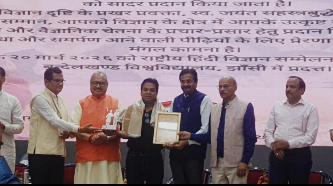 इटावा । विज्ञान भारती ब्रह्मावर्त कानपुर प्रांत द्वारा बुंदेलखंड विश्विद्यालय झांसी के भव्य गांधी सभागार में उत्तर प्रदेश सरकार,मध्य प्रदेश विज्ञान एवं प्रौद्योगिकी परिषद,सीएस आईआर (निष्पर) द्वारा प्रायोजित राष्ट्रीय हिन्दी विज्ञान सम्मेलन, 2025- 26 में *जयंत सहस्त्रबुद्धे विज्ञान विशारद सम्मान 2025*
