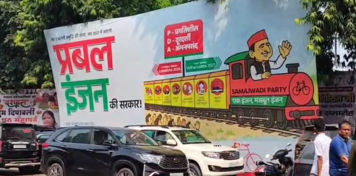 – सपा कार्यालय के बाहर लगी अनोखी होर्डिंग ने मचाई सनसनी, ट्रेन के इंजन पर सवार दिखे अखिलेश यादव — 2027 चुनाव से पहले सियासी गर्मी तेज