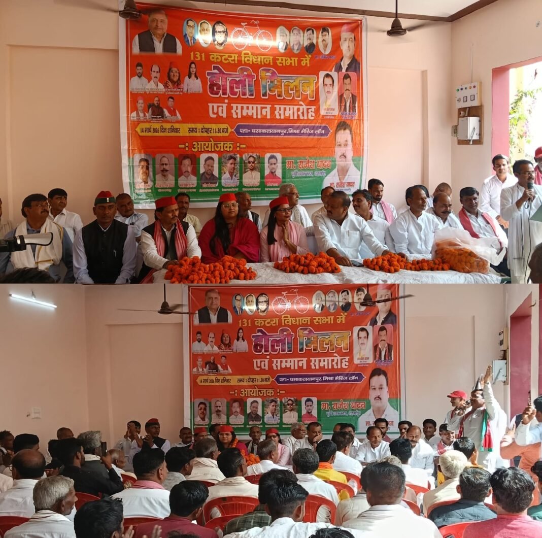 शाहजहांपुर। 131 कटरा विधानसभा क्षेत्र में समाजवादी पार्टी की ओर से शनिवार (14 मार्च 2026) को मिश्रा मैरिज लॉन, घसा कल्यानपुर में होली मिलन समारोह का भव्य आयोजन किया गया। कार्यक्रम में क्षेत्र के कई प्रमुख नेता और कार्यकर्ता शामिल हुए तथा एक-दूसरे को गुलाल लगाकर होली की शुभकामनाएं दीं।