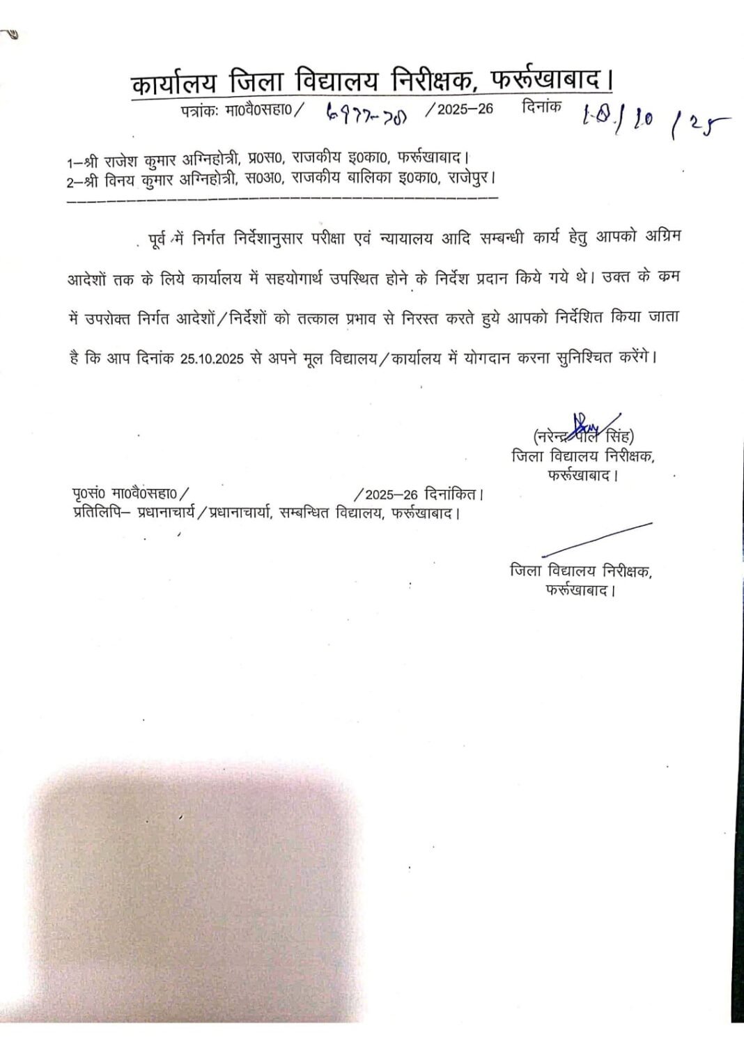 जिला विद्यालय निरीक्षक कार्यालय द्वारा जारी पत्र (दिनांक 18 अक्टूबर 2025, पत्रांक: मा./वै./सहा./6977-78/2025-26) के अनुसार, राजेश कुमार अग्निहोत्री (प्रभारी, राजकीय इंटर कॉलेज फर्रुखाबाद)को निर्देश दिया गया है कि वे तत्काल अपने मूल विद्यालय में योगदान करें। यह आदेश, प्रशासनिक सूत्रों के अनुसार, कार्यालय की अंदरूनी साजिशों और चल रहे विवादों के दबाव में लिया गया निर्णय बताया जा रहा है।