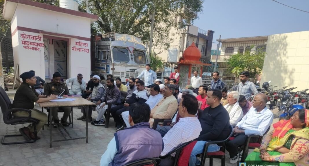 फर्रुखाबाद। आगामी होली पर्व, होली पर निकलने वाले जुलूस, ईद तथा जुमा नमाज को सकुशल और शांतिपूर्ण ढंग से संपन्न कराने के उद्देश्य से जनपद पुलिस प्रशासन पूरी तरह सतर्क नजर आ रहा है। पुलिस अधीक्षक आरती सिंह के निर्देशन में क्षेत्राधिकारी मोहम्मदाबाद ने कोतवाली मोहम्मदाबाद परिसर में संभ्रांत व्यक्तियों एवं पीस कमेटी के सदस्यों के साथ एक महत्वपूर्ण बैठक आयोजित की।