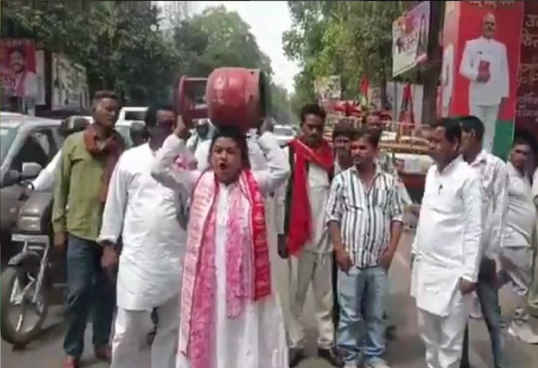 सपा कार्यालय के बाहर महिला सभा नेता का प्रदर्शन, सिर पर सिलेंडर रख सरकार के खिलाफ की नारेबाजी