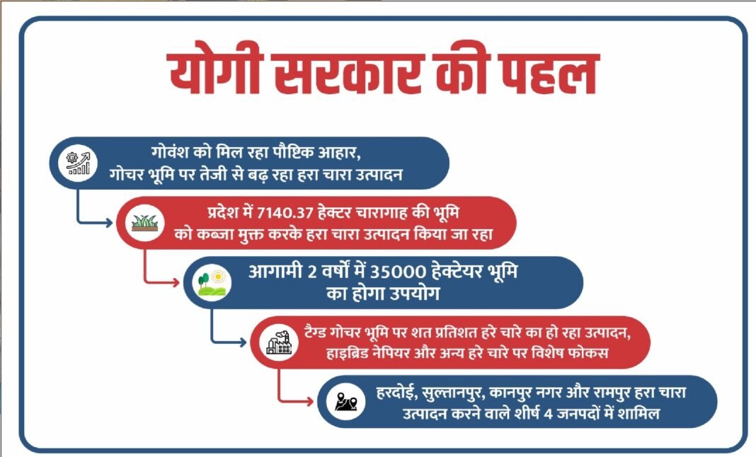 भविष्य की आवश्यकताओं को ध्यान में रखते हुए योगी सरकार ने बड़ा लक्ष्य निर्धारित किया है। आगामी दो वर्षों में 35000 हेक्टेयर कब्जा मुक्त एवं सिंचित चारागाह भूमि पर हरा चारा उत्पादन कराया जाएगा। पशुपालन विभाग के प्रमुख सचिव मुकेश मेश्राम ने बताया कि प्रदेश में अब तक 1691.78 हेक्टेयर क्षेत्र में हाइब्रिड नेपियर तथा 5448.59 हेक्टेयर भूमि पर अन्य हरे चारे (जई, बरसीम आदि) की बुआई की जा चुकी है। इससे गोवंश को वर्षभर संतुलित और पौष्टिक आहार उपलब्ध कराया जा सकेगा।