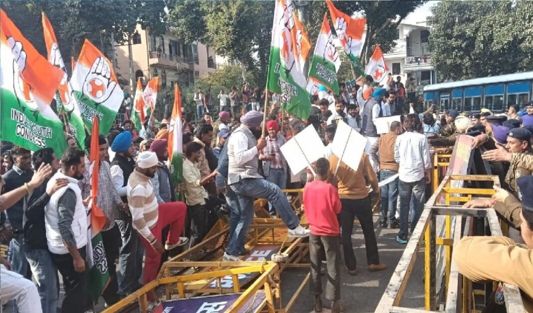 कई प्रदर्शनकारियों के बैरिकेड्स पर चढ़ने और जबरन अंदर घुसने की कोशिश करने पर तनाव बढ़ गया। कुछ ही मिनटों में पुलिसकर्मियों और युवा कांग्रेस सदस्यों के बीच हाथापाई शुरू हो गई। कुछ प्रदर्शनकारियों ने बैरिकेड्स तोड़ने के प्रयास में ट्रैक्टर भी आगे बढ़ा दिए, जिससे गतिरोध और बढ़ गया। इसके बाद पुलिस अधिकारियों ने कई नेताओं को हिरासत में लिया और उन्हें बसों में भरकर ले गए।